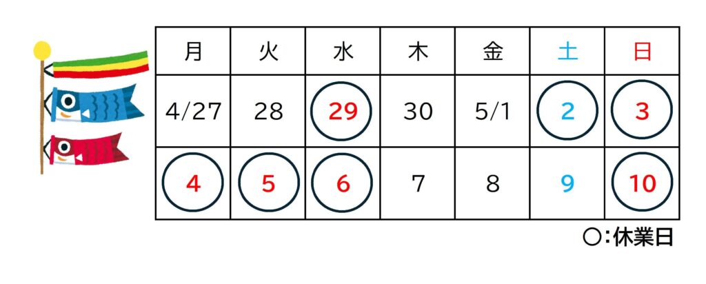 休業期間: 2026/5/2(土)~2026/5/6(水)
